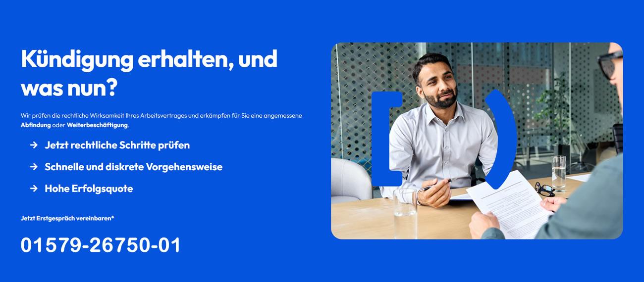 Eine Kündigung trifft fast immer überraschend – und selten zur richtigen Zeit. Plötzlich stehen Einkommen, berufliche Zukunft und private Verpflichtungen auf dem Spiel. KÜNDIGUNG-SOS ist Ihre spezialisierte Anlaufstelle in Deutschland, wenn es ernst wird: Wir prüfen Ihre Kündigung, sichern Fristen, verhandeln Abfindungen und setzen Ihre Rechte konsequent durch – klar, strukturiert und so schnell, wie es Ihre Situation verlangt.